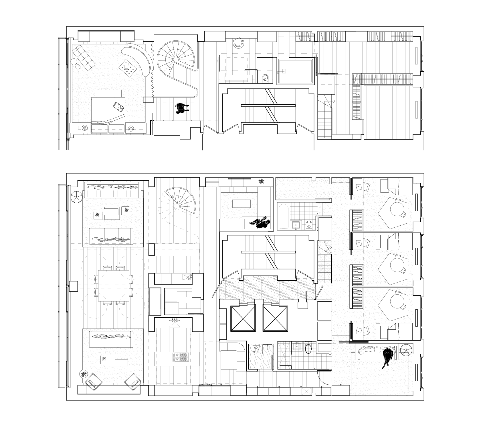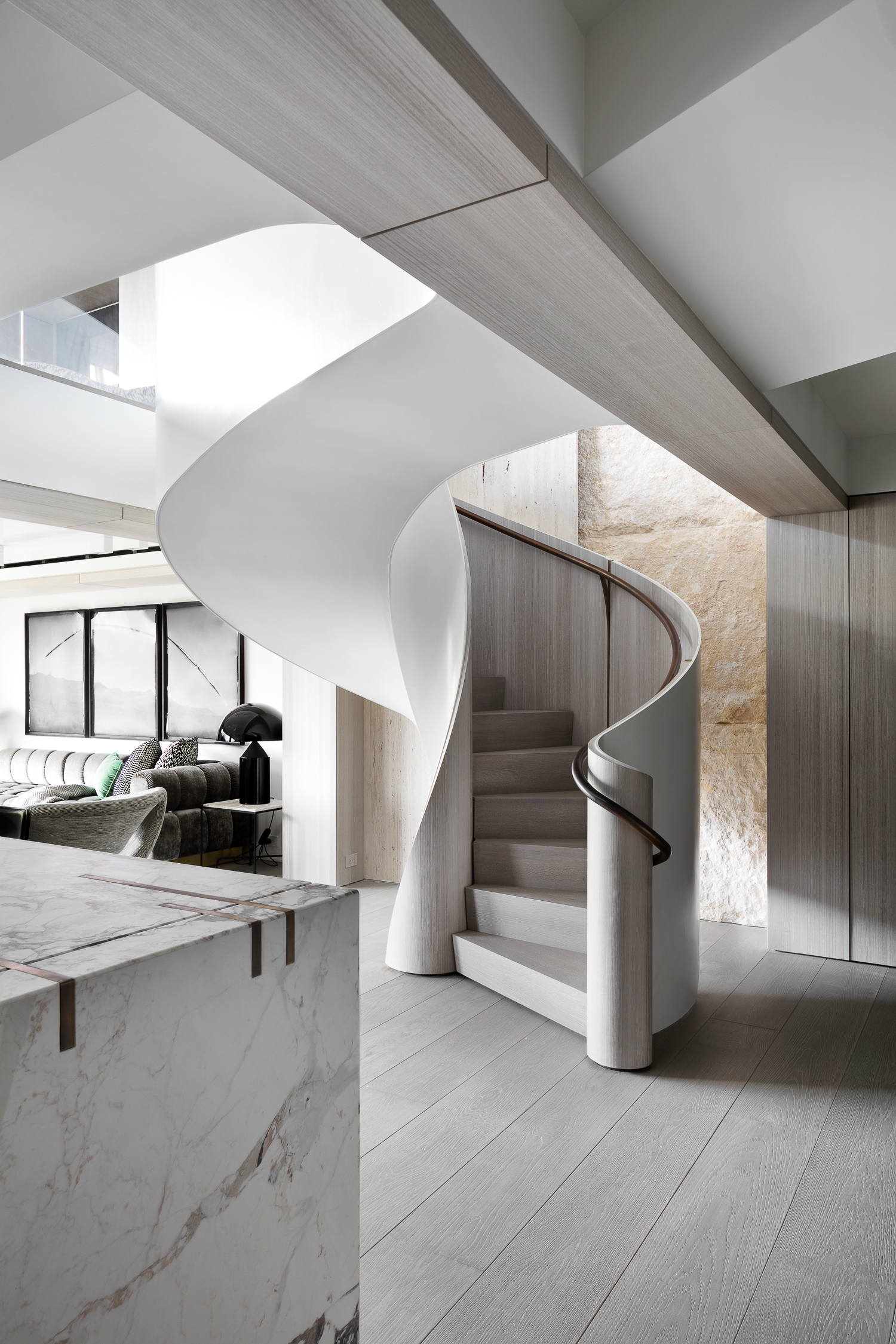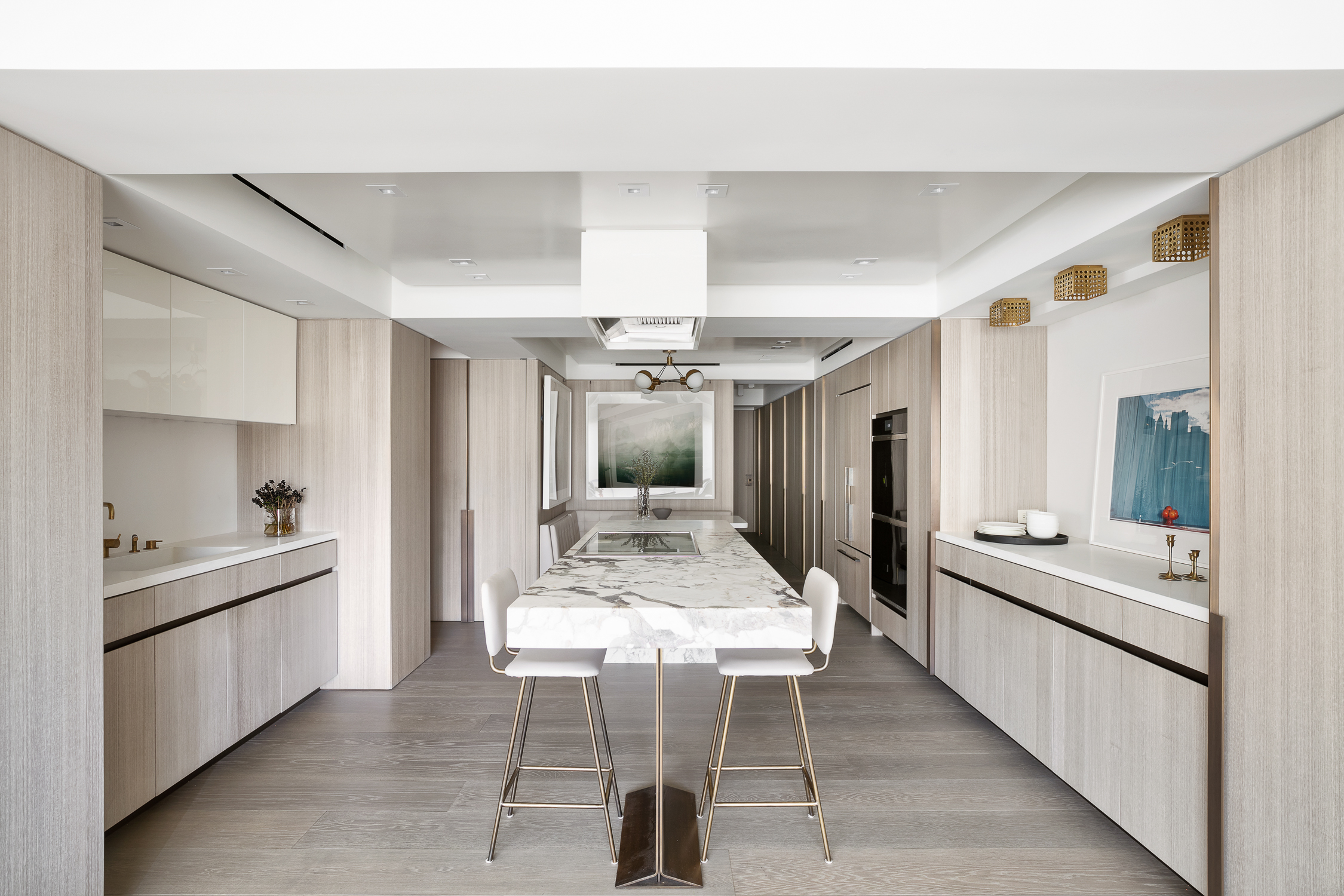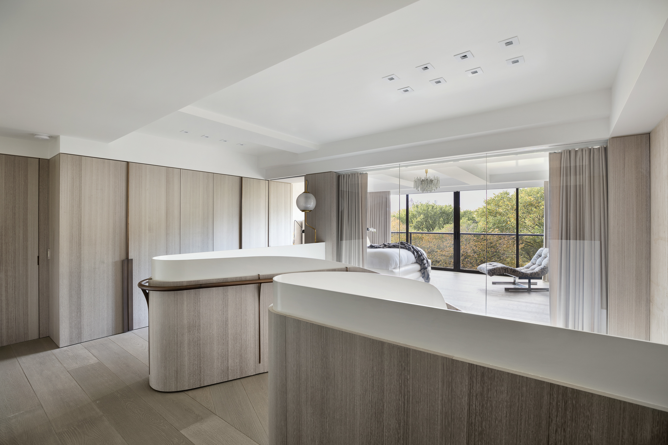 The upper floor is fully dedicated to the master bedroom suite, with the master bedroom facing Central Park. On the lower floors, the children’s bedrooms were placed on the courtyard side, and while the gather spaces faced the park. To create a fluid connection between the master bedroom area and the lower floor, a double height space was created with a spiral staircase. The kitchen then acts like a center space in the apartment, connecting the back areas of the 7th floor and the grand gathering spaces of the dining room and living room, all being exposed to a great view over Central Park.