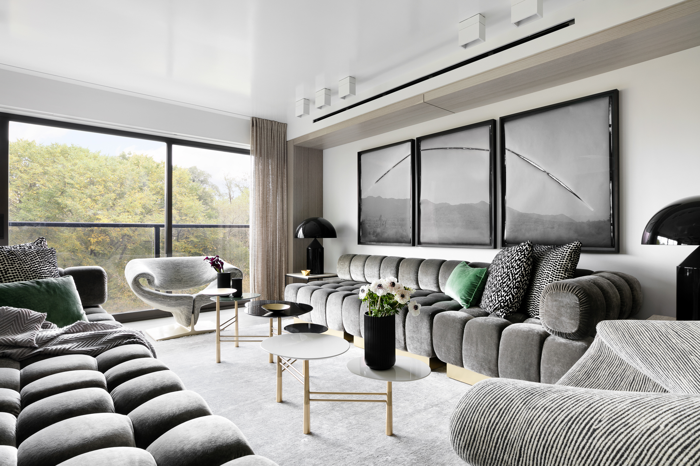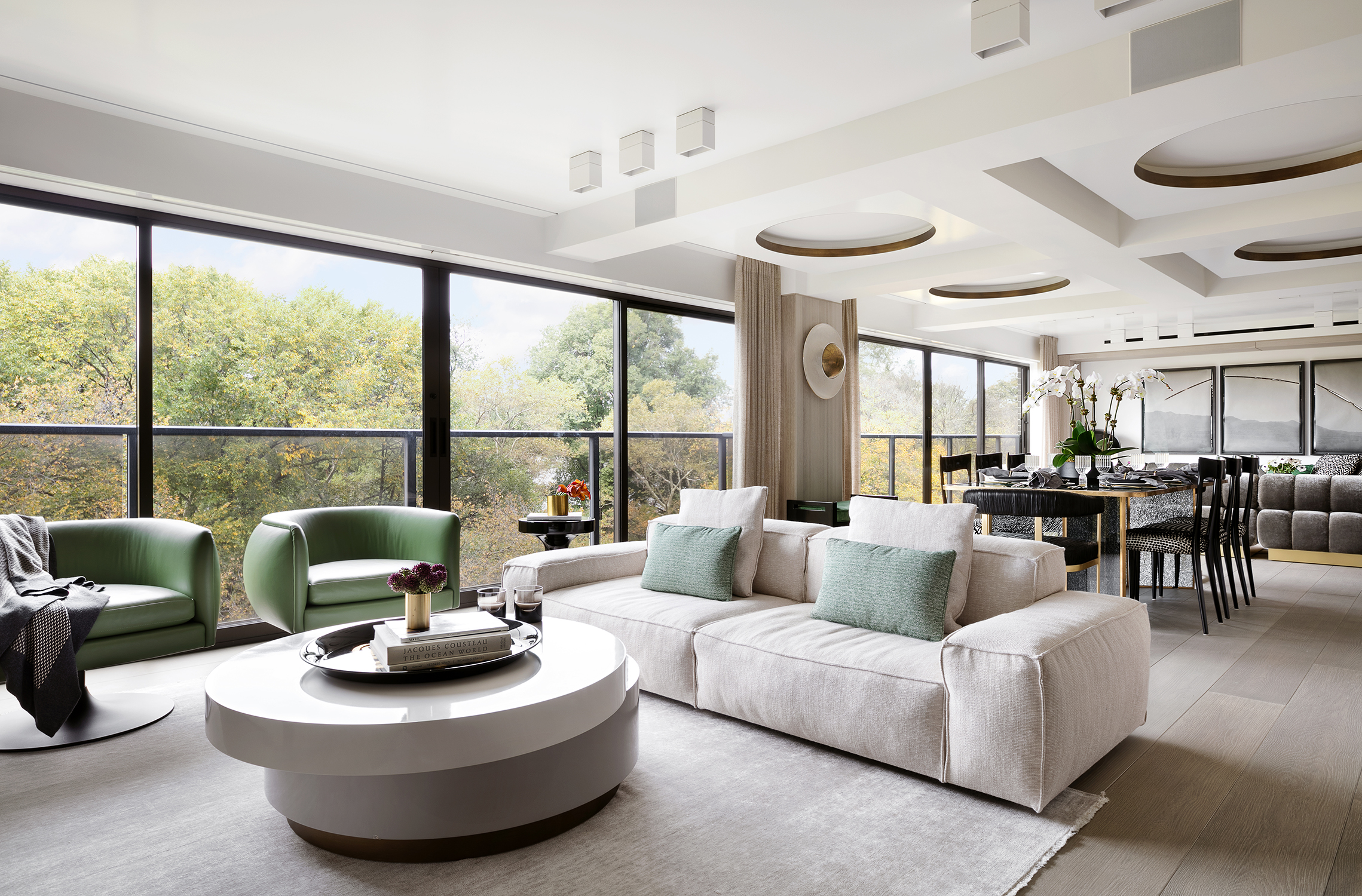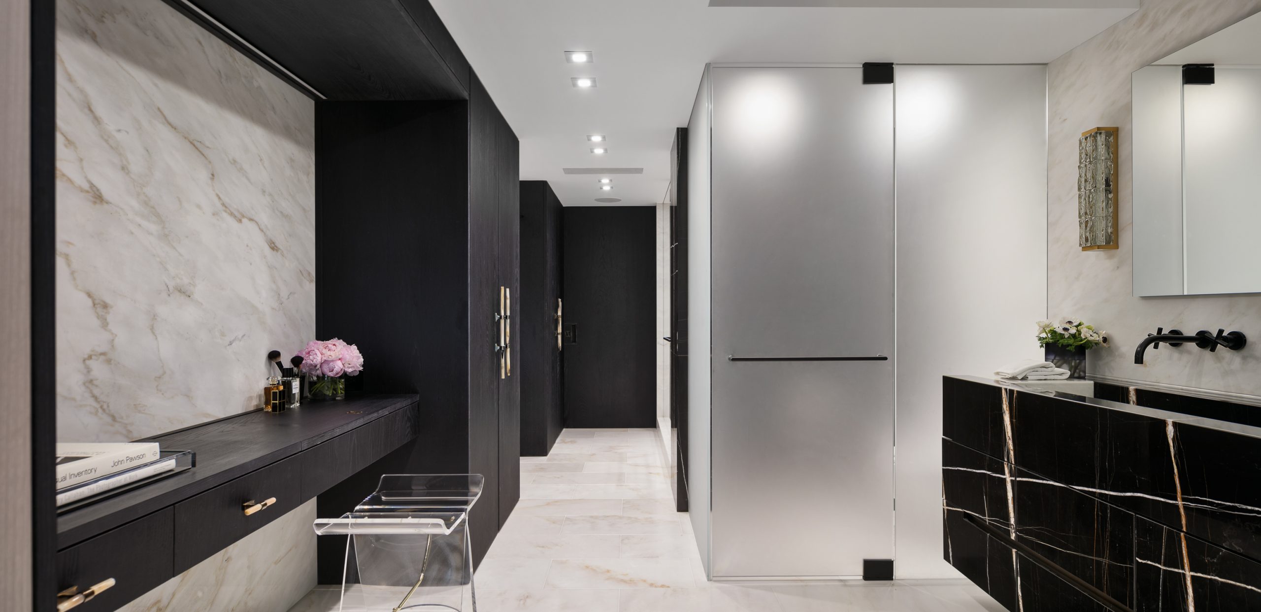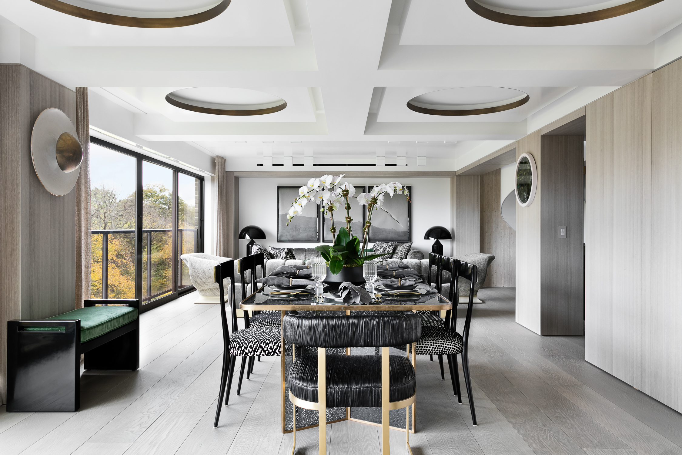 The upper floor is fully dedicated to the master bedroom suite, with the master bedroom facing Central Park. On the lower floors, the children’s bedrooms were placed on the courtyard side, and while the gather spaces faced the park. To create a fluid connection between the master bedroom area and the lower floor, a double height space was created with a spiral staircase. The kitchen then acts like a center space in the apartment, connecting the back areas of the 7th floor and the grand gathering spaces of the dining room and living room, all being exposed to a great view over Central Park.