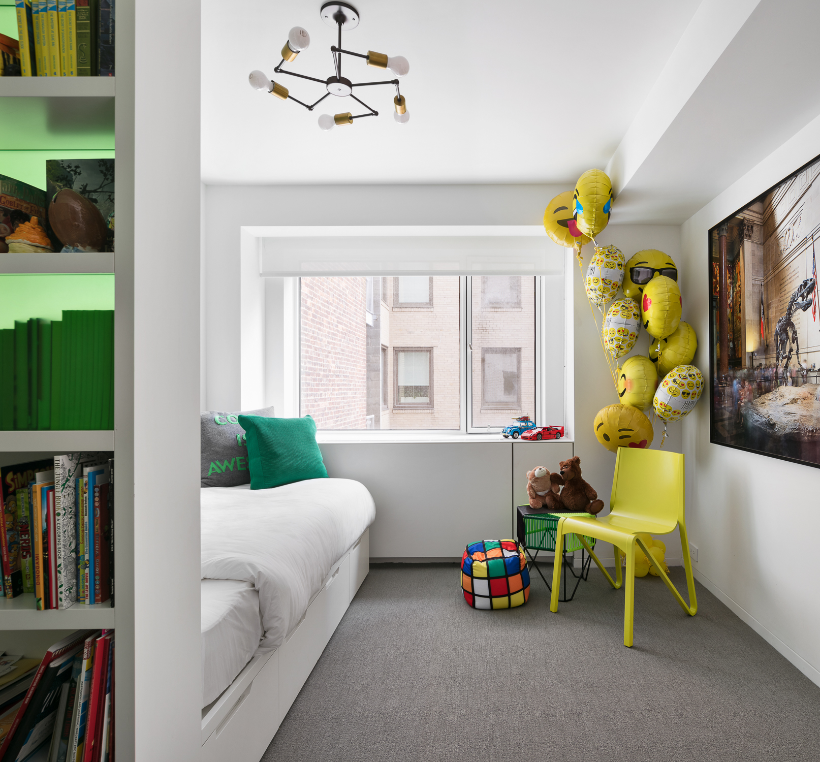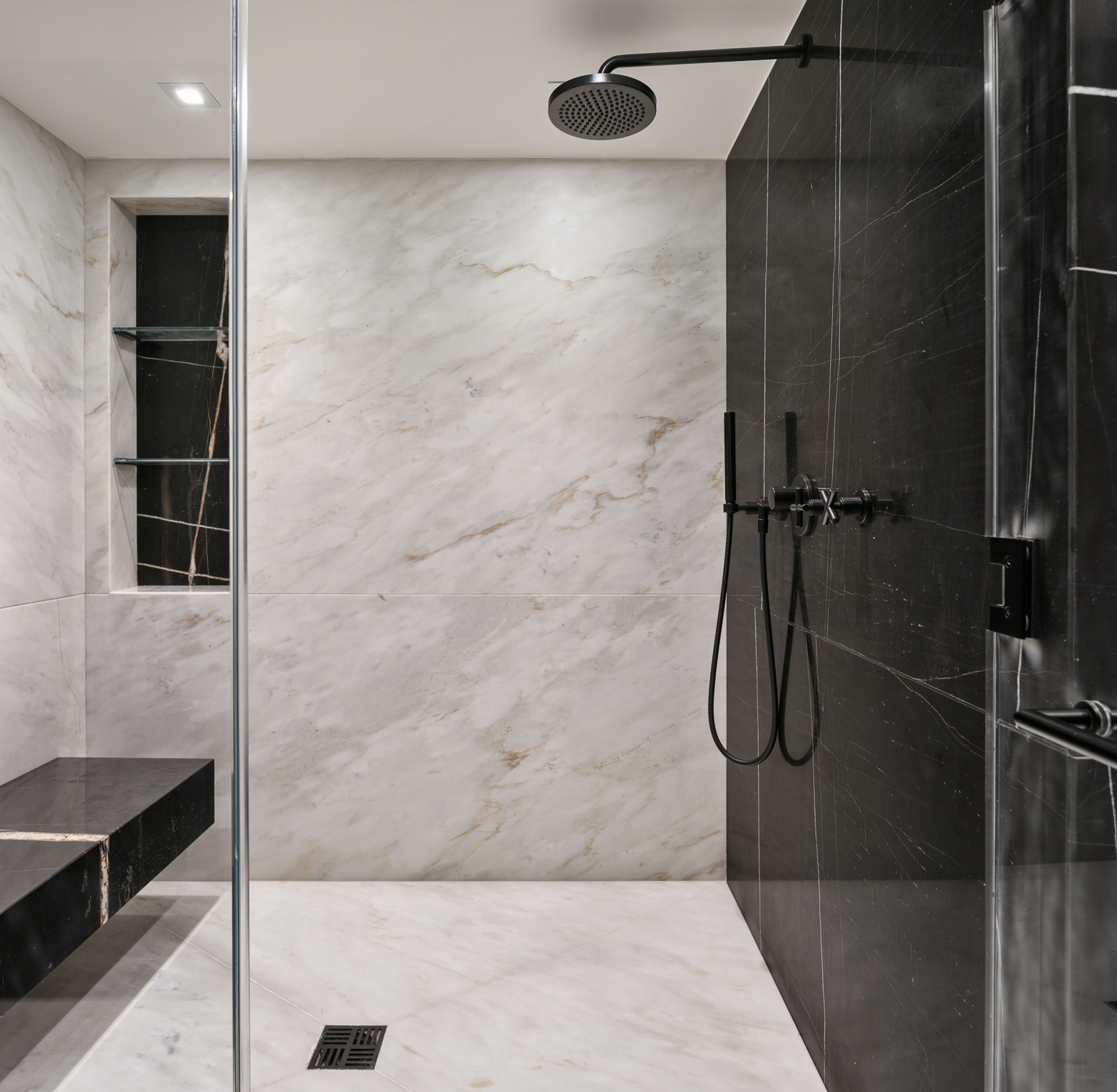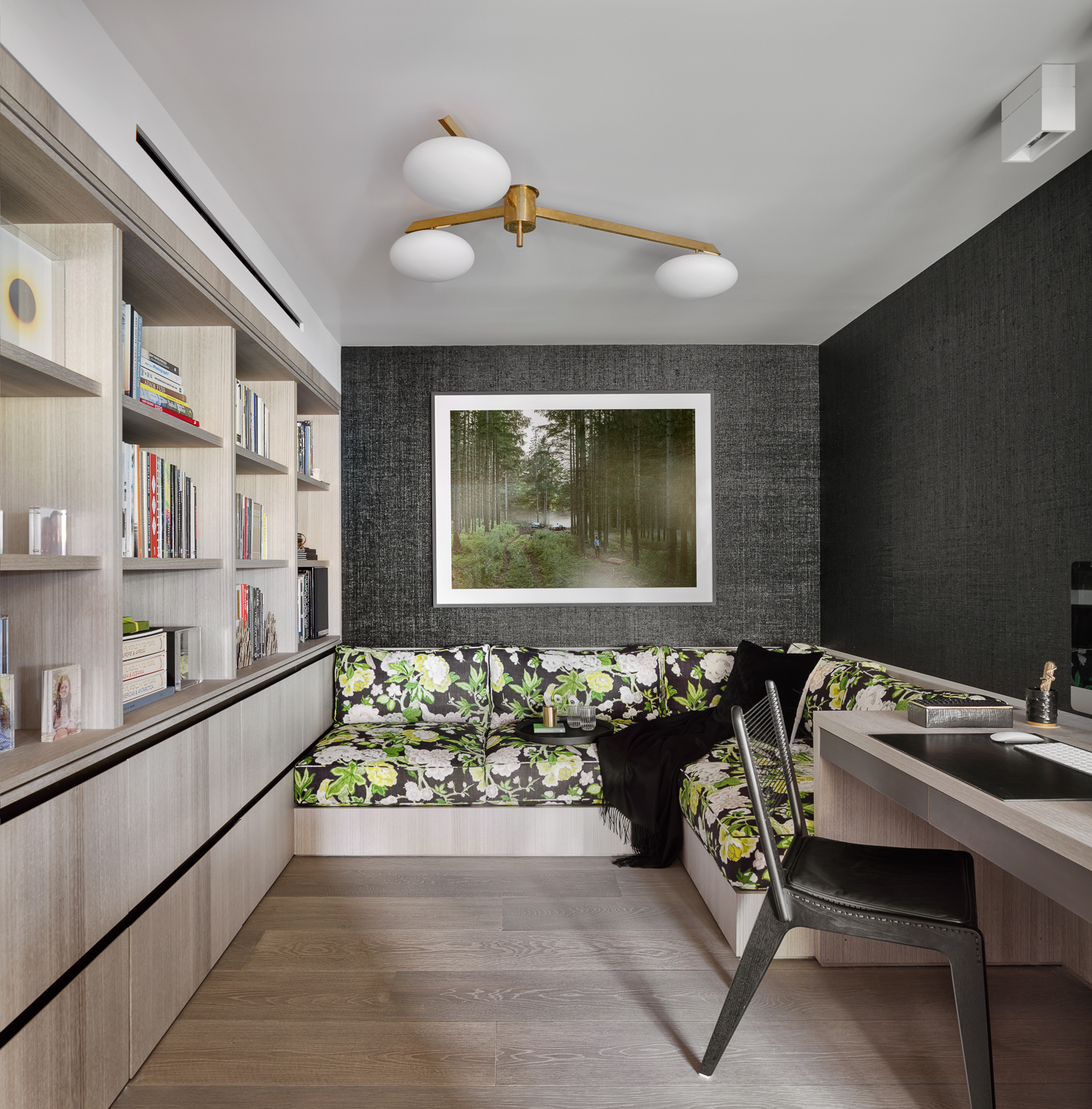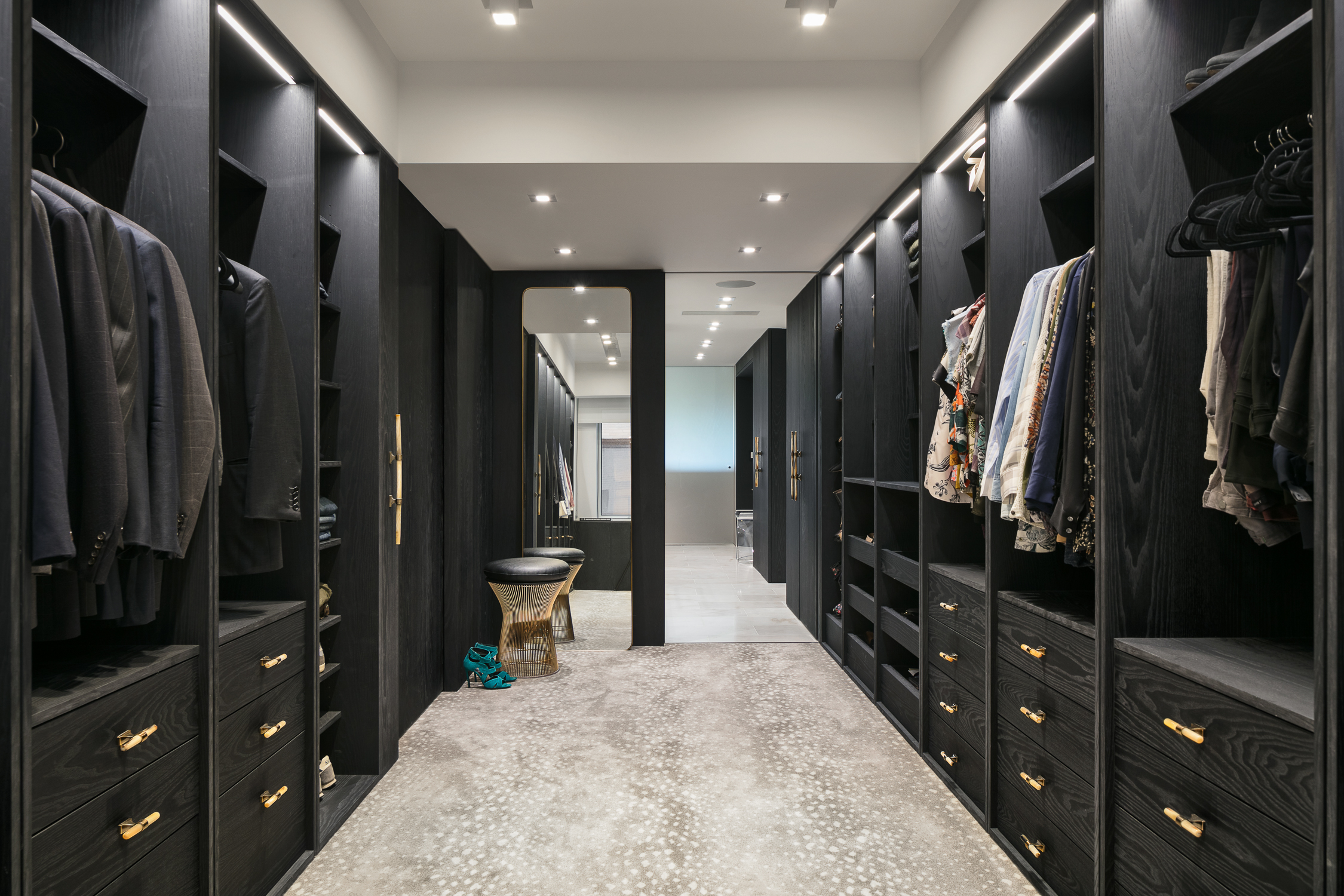 The upper floor is fully dedicated to the master bedroom suite, with the master bedroom facing Central Park. On the lower floors, the children’s bedrooms were placed on the courtyard side, and while the gather spaces faced the park. To create a fluid connection between the master bedroom area and the lower floor, a double height space was created with a spiral staircase. The kitchen then acts like a center space in the apartment, connecting the back areas of the 7th floor and the grand gathering spaces of the dining room and living room, all being exposed to a great view over Central Park.