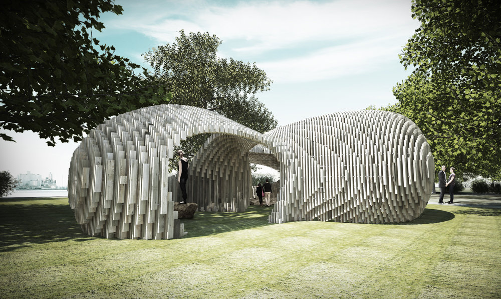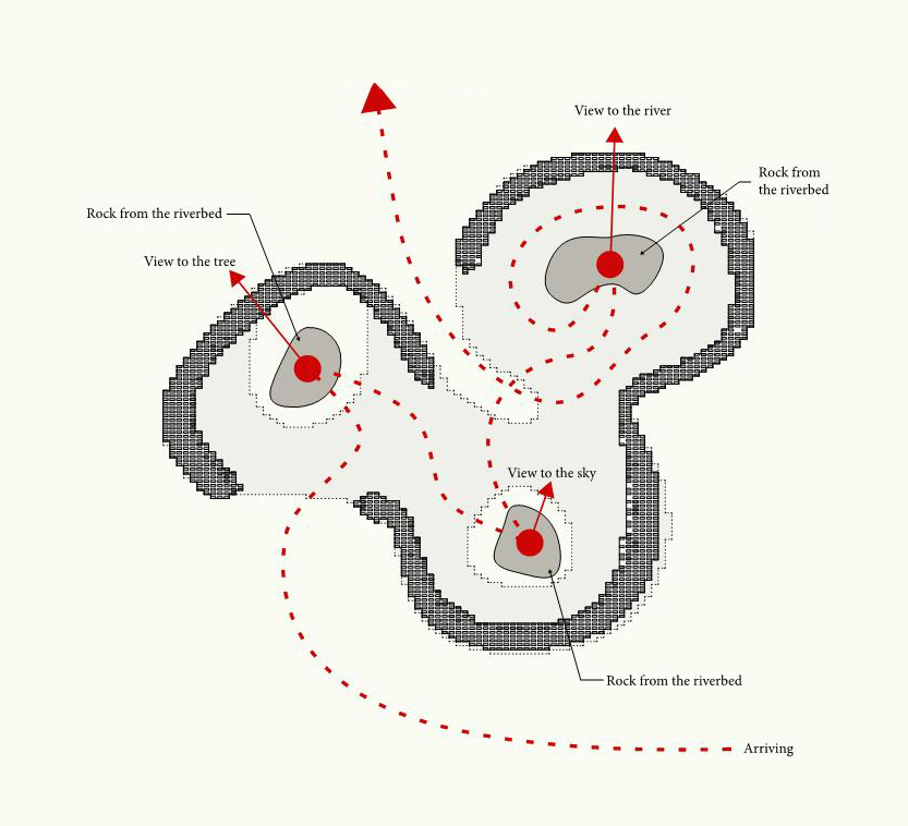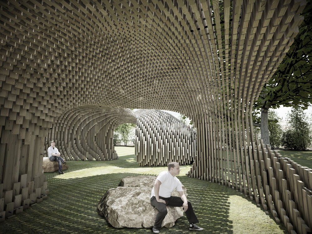 The voyage to The Palace sheds the city as visitors navigate bridges, subways, and buses to walk to its threshold. Once there The Palace sits in front of us as an amorphic muse shifting in the winds of our foundation. Earth is its foundation. The palace moves in the space between the ground and the sky, as it edges are not sharply cut but rounded like the wind. Constructed from the sticks of our labor, the sun dances through its naked body, inviting play against the hard worked river. In The Palace, dreams of our past lie still while the future twists as we turn.
